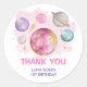 Este adesivo redondo mágico apresenta planetas imaginários, lua e estrelas em pintas, roxas e douradas.