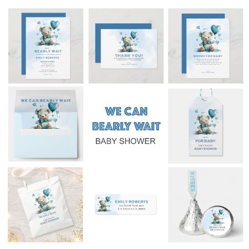 Este chá de fraldas giro, podemos ser um design de 'esperar', apresenta um adorável ursinho de peluche de aquarela com balões em forma cardíaca e tipografia azul e preta personalizável.