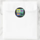 Uma imagem de um esquilo fotomanipulada num estilo de pop art em azul, verde, amarelo, laranja, turquesa e roxo contra um fundo preto num adesivo