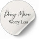 Minimalist Christian sticker featuring the phrase “Pray More Worry Less” — a simple and encouraging reminder to choose prayer over fear.