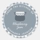 Presente de Comida caseiro da cozinha do adesivo redondo clássico azul empoeirado ou etiqueta de tampa do jar... Um padrão empoeirado de verificação de xadrezes de búfalos brancos e azuis borda o texto do produto de comida caseira nessas etiquetas adesivas redondas para dar seus emperramentos caseiros, preservações e retoque. No centro da etiqueta encontra-se um gráfico de pote azul empoeirado escuro com o texto branco "da cozinha de" sobre o nome do produto e o nome do cozinheiro. Você pode revisar todo o texto de acordo com suas próprias necessidades no modelo de personalização prático.