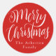 Um tratamento de tipo Feliz Natal manuscrito exclusivo salta contra um fundo vermelho neste adesivo redondo. A cor do fundo é vermelha, mas pode ser alterada clicando em "personalizar". O rótulo também apresenta um espaço para o seu texto personalizado. Perfeito para etiquetas ou rótulos de presente, biscoitos de Natal ou qualquer outra forma de espalhar alegria natalina.