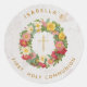 Esta elegante adesivagem floral adesivo de primeira comunhão para convites ou lembrancinhas de primeira comunhão de menina tem uma cruz dourada numa coroa de rosas silvestres no centro. O fundo é de mármore branco. Todo o texto, escrito em volta da coroa de rosas, tem uma cor amarela dourada, semelhante à cruz dourada.