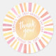 Este design de adesivo redondo apresenta um sol vibrante no centro, com a frase alegre "Obrigado!" colocada em cima. Os raios do sol brilham em tons quentes de amarelo, laranja, rosa e vermelho, acrescentando um toque brilhante e alegre à sua Primeira Viagem em torno da celebração do primeiro aniversario do Sol. Ao cercar o sol, "Primeira Viagem ao redor do Sol" e a data de aniversário são colocados elegantemente ao redor da borda, criando um design perfeito e personalizado. Este adesivo é uma adição perfeita a favores, presentes de obrigado ou decorações, amarrando lindamente sua festa temática do sol. Totalmente personalizável, você pode atualizar a data para corresponder aos detalhes da celebração. Uma maneira doce e atenciosa de mostrar apreço aos seus convidados!