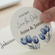 Um adesivo Save the Date com design elegante, com tulipas azuis delicadas no estilo de aquarela suave. As flores, pintadas em tons de céu e azul-marinho, enquadram graciosamente o texto elegante nas fontes de Garamond Roman e Mondays, dando-lhe um eterno e aparência sofisticada. O fundo do autocolante é um marfim suave, branco-esbranquiçado ou leve, que melhora o encanto da tipografia. Perfeito para convites para casamentos, anúncios especiais, ou qualquer ocasião elegante, este adesivo combina elegância floral com tipografia clássica para um efeito atordoante.