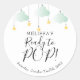 Adesivo redondo clássico para chã de bebê 'Ready to POP twinkle twinkle' com nuvens verde menta e estrelas douradas em cordas, em fundo branco. Esses adesivos para chã de bebê neutros, para casal ou para sprinkle são perfeitos para selar envelopes e lembrancinhas. Personalize com os detalhes do seu evento especial. Criado por Thisisnotme©