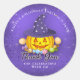 O obrigado roxo do Halloween que você cola apresenta uma abóbora fofinha amigável vestindo uma bruxa roxa cheia de estrelas cintilantes, doces de halloween, fundo cintilante e um obrigado de listras laranja, seu roteiro cursivo.
