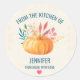 Um adesivo personalizado que diz: Da Cozinha de, com seu nome. Também diz: caseiro com amor. O fundo é uma cor creme com um aspecto envelhecido. Ilustrada com uma abóbora cor d'água laranja com folhas coloridas de outono. perfeita para assar e enlatar.