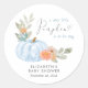 Um adesivo bonito e bonito para os convites para chás, favoritos para festas e cartões de agradecimento do seu bebê, com "A Sweet Little Pumpkin Is On Your Way" escrito em uma mistura de tipografia azul moderna e roteiro de na moda com uma haste cardíaca, e um buquê de aquarela de uma abóbora azul pastel, florais laranja e verde. Personalize o nome da mãe e a data do chá em uma simples tipografia moderna de cinzas de luz.