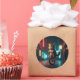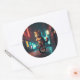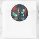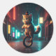 Um encantador adesivo de arte em pixel com felino apalpador, com um chapéu e monóculo de topo, montando graciosamente um monociclo através de uma paisagem urbana iluminada por neon. Um acessório perfeito para os pertences de qualquer amante de gatos.