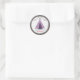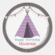 Um adesivo de aniversário com tema de acampamento que apresenta uma ilustração de uma tipi e um bunting de chevron púrpura. O fundo é inspirado na madeira. Personalize o texto. Procure convites na Paperie de Jill.
