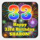 This joyful and cheerful birthday-themed square sticker design features a large number “33” having a colorful rainbow spectrum gradient inspired pattern. It also features the message “Happy 33rd Birthday,”, and an editable name. The background features a multicolored pattern inspired by the look of bursting celebratory fireworks. Fun, vibrant, personalized stickers like this might be given as a birthday present, or used while wrapping presents/gifts, or perhaps used as a birthday party decoration when celebrating somebody’s thirty third birthday. [~Z0000579]