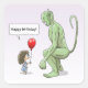 A garota diz feliz aniversário para sua amiga o grande goblin verde.