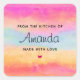 Etiquetas de cozinha com uma imagem de um desenho abstrato pintado. Listras amarelas azuis e rosa. Padrão de fundo torto e vibrante.