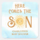 O adesivo de chá de fraldas deste menino bonitinho mostra o texto "Aqui Vem O Filho" em tipografia marrom na moda com um sorridente sol de aquarela amarela e céu azul. Facilmente personalizável. Porque nós criamos a nossa trabalho de arte, você não encontrará esta imagem exata de outros designers. Original Watercolor © Michele Davies.