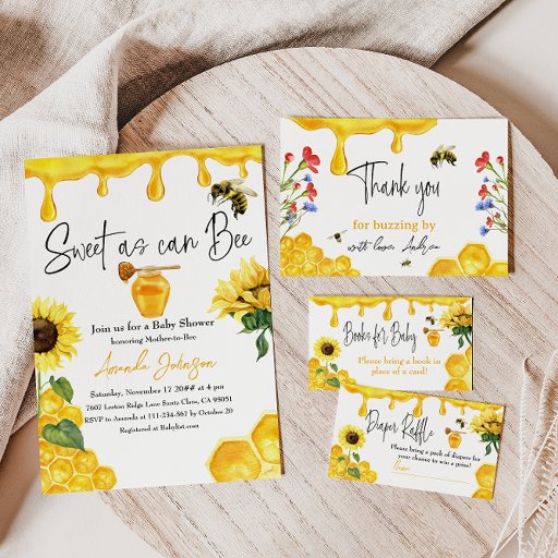 O Chá de fraldas neutro de gênero, doce e modesto, era constituído por mel amarelo de cor d'água, abelhas, favos de mel e girassol. Produtos correspondentes que você pode encontrar na coleção.