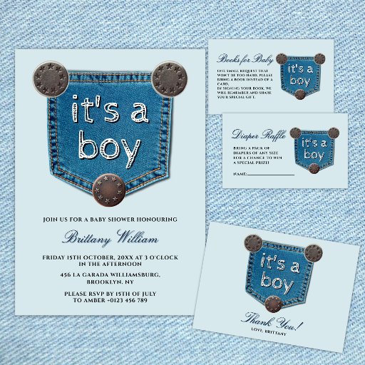 Este design apresenta um tema de chá de fraldas inspirado na Americana "Blue Jean It's a Boy" com jeans de denim bonitinhos e brincalhões em um fundo azul pastel. Este produto pode ser facilmente personalizado. Se precisar de ajuda para a personalização do produto ou se precisar de produtos correspondentes, por favor contacte-me através do Zazzle.