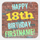 Este design de autocolante de aniversariante divertido apresenta uma mensagem como "FELIZ 18º ANIVERSÁRIO, NOME PRÓPRIO!", onde o nome pode ser personalizado. O fundo apresenta uma representação de uma parede de tijolos constituída por alguns tijolos de cor castanha avermelhada. O texto de mensagem personalizável apresenta cores como azul, amarelo e verde, e tem uma aparência inspirada pela do grafite pintado. Os adesivos como estes poderiam talvez ser dados como presente de aniversário, ou talvez utilizados como decorações numa festa de aniversário para alguém que comemora o seu décimo oitavo aniversário. [~Z0000273]