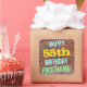 Este design de autocolante de aniversariante divertido apresenta uma mensagem como "FELIZ 55º ANIVERSÁRIO, NOME PRÓPRIO!", onde o nome pode ser personalizado. O fundo apresenta uma representação de uma parede de tijolos constituída por alguns tijolos de cor castanha avermelhada. O texto de mensagem personalizável apresenta cores como azul, amarelo e verde, e tem uma aparência inspirada pela do grafite pintado. Os adesivos como estes poderiam talvez ser dados como presente de aniversário, ou talvez usados como decorações numa festa de aniversário para alguém que comemora o seu cinquenta quinto aniversário. [~Z0000273]