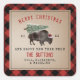 Ilustração de um búfalo vestindo um chapéu de Santa com neve coberta de árvore de Natal amarrada às costas. A borda é o padrão de xadrez de búfalo vermelho e preto.
