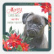 Neste adesivo, um adorável cachorro preto é enquadrado com buquês de poinsettia vermelha de aquarela de Natal. Uma borda externa de verde azul correspondente rodeia o branco interior, e mais imagens de poinsettia estão no canto superior direito. O texto vermelho e lacrimogêneo diz "FELIZ ANO NOVO NATAL MERRY". Engraçado para sua correspondência de Feriado ou pacotes de presentes.
