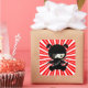 Uma ilustração bonito dos desenhos animados de um cão de filhote de cachorro do ninja do kawaii em um fundo vermelho e branco retro do teste padrão do sunburst. O cão do ninja tem uma espada, umas estrelas de jogo e umas armas tradicionais do ninja.