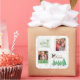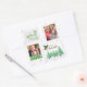 Os autocolantes de Natal, personalizados com 2 das suas fotografias e selos de correio decorados com árvores de natal, palavras ocas e festivas (Deixem-no nevar, Feliz Natal e Feliz e brilhante). Dois dos carimbos têm suas fotos, exibidas como um retrato vertical e um quadrado.