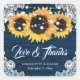 Costume marinho azul de girassol rústico bengalas de casamento/selas de envelopes com girassol sobre um fundo de madeira rústica adornado com rendas florais brancas e luzes de cordas. Itens correspondentes disponíveis.