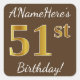 Este simples design de aniversário apresenta uma mensagem como "ANameHere's 51rua Birthday!", com a "51ruas" a ter uma aparência falsa e imitada de cor inspirada no ouro, sobre um fundo de cor castanha. O nome pode ser personalizado. Os adesivos como estes poderiam talvez ser um presente para alguém que comemora os cinquenta anos do primeiro aniversário, ou talvez pudessem ser usados como decorações numa festa de aniversário. [~Z0000249]