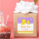 Este adesivo giro e divertido apresenta um adorável pato amarelo e patinando em bolhas brancas de banho de sabão sobre um fundo roxo brilhante com fita laranja e listras amarelas. O texto combina o script manuscrito e as fontes sans serif para uma aparência na moda e moderna. Isto é perfeito para um Chá de fraldas.