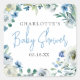 Flores brancas e alegres e folhas de cor d'água verde formam uma bela borda em adesivos azuis bonito para chás de fraldas. Um guião moderno e manuscrito para o seu brunch de jardim ou chá para uma mãe grávida esperando um menino. Adorável cúmplice para um convite ou favor de uma festa de chá da tarde.