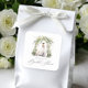 Um adesivo de Chá de Noiva elegante apresenta a escrita caligráfica '' chá de noiva '' em letras manuscritas da moda, portão arqueado com flores em aquarela, folhagem verde e noiva com vestido de noiva. Personalize com um nome.