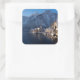 O autocolante quadrado com a cidade de Hallstatt coberta de neve ao lado do lago Hallstätter See, com montanhas Alps no fundo, à luz do nascer do sol, numa paisagem de inverno na Áustria.