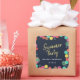 Um convite de festa de verão, escrito à mão e com pontos e lanternas coloridos ao redor