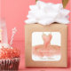 Um lindo vestido de coral de aquarela com borda brilhante dourada e letra de script elegante em todas as informações pessoais. A cor do roteiro é lindamente emparelhada com a cor do vestido.