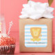 Leão bonito sentado com fundo azul e listras brancas. Personalizar com mensagem.. O esquema de cores é adequado para meninos e leões também é adequado para crianças com o sinal de Leo Zodiac nascer de 22 de julho a 23 de agosto.