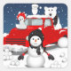 Esta design apresenta a nostalgia de um caminhão vermelho vintage com alguns animais árcticos e um boneco de neve em uma cena de vitória.