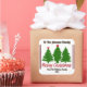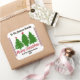 Um belo adesivo quadrado enfeita um presente lindamente embrulhado, com árvores verdes vibrantes e uma feliz mensagem de Feliz Natal. Este sotaque colorido acrescenta um toque festivo, perfeito para compartilhar amor e celebração durante o feriado.