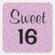 Um doce adesivo quadrado de 16 com brilho lilás, brilho violeta e escrevendo negro.
