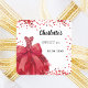 Para uma doce 16, 16ª festa de aniversário. Um fundo branco com confete vermelho, um vestido e um grande arco vermelho. O nome é escrito com um moderno estilo escrito à mão. Personalize e adicione seu nome e uma data.