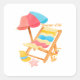 Un design estival et coloré avec chaise longue, parasol rayé, chapeau de paille, étoile de mer et panier fleuri. Style aquarelle doux et joyeux, parfait pour célébrer les joies de l'été.