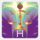 Elegante Justice Symbol (Símbolo de Justiça Elegante), artista.classy ouro escala com gemstones vermelhos roxos 3D, luzes vibrantes e ondas fractais em roxo, verde, violeta, azul-aqua, azul-turquesa, azul-turquesa, cor verde, amarelo, branco por Búlgaro Lumini (c).