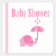 Este adesivo de chá de fraldas quadrado arredondado tem um elefante rosa segurando um guarda-chuva com algumas gotas de chuva caindo. Há um padrão de listras e polkadots no lado esquerdo. No topo, o Chá de fraldas é escrito em cores rosa alternadas. Gráficos por DreAmLoft no MyGrafico