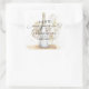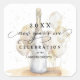 Stylish New Year's Eve party square stickers feature a watercolor champagne bottle and gold and white balloons with your details in chic lettering.