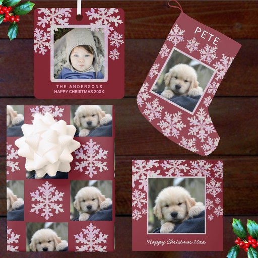 Coordenando-se com a suíte de flocos de neve opal cor-de-rosa de cheio, esses personalizados adicionam seus autocolantes fotoquadrados fazem dupla função como selo de envelope e etiqueta de endereço de retorno, perfeita para qualquer evento de feriado de inverno. Uma camada de gradiente leve em tons brancos, de baixo para cima, sobre sua foto familiar, permitindo o simples texto vermelho burgundy e falso falso falso falso flocos de neve opais rosa e iridescentes de ambos os lados para pop. Adicione seu nome e endereço e troque Felizes Feriados para Feliz Natal, como você prefere para adesivos de endereço de retorno verdadeiramente personalizados. Adicione a sua foto favorita a estas etiquetas de flocos de neve opais cor-de-rosa divertida para um toque elegante nas suas mensagens de Natal. Confira todos os itens correspondentes do seu próprio Floco de Neve Opal Rosa disponíveis exclusivamente no meu compro ArtfulDesignsByVikki e adicione um sotaque personalizado aos seus feriados.
