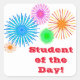 Esta design apresenta a frase "Estudante do Dia!", junto com alguns padrões que se assemelham a fogos de artifício de várias cores que explodem no ar. Este autocolante poderia ser usado para recompensar um estudante que tenha mostrado comportamento ou realização excepcionais.