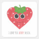 Este adesivo é impresso com um design de morango de coração desenhado à mão e as palavras "Eu te amo muito" são digitadas abaixo.