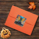 Uma fada com asas laranja e amarelas sentadas sobre passos de pedra que levam talvez ao reino Fada. A Fada Afro-Americana não está sozinha, ela está com o seu cão guardião doberman neste Dia do Outono.
