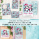 Crie adesivos personalizados de Natal para selagens de envelopes ou favores com um design azul e rosa que apresenta um ditado "Feliz Natal" e uma família de pinguins bonitinha em chapéus cor-de-rosa de Papai Noel projetados sobre fundo de neve. O modelo facilita a digitação do nome da família e do ano.
