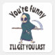 Design do Halloween engraçado e assustador com um esqueleto engraçado da Grim Reaper segurando uma cicatriz e dizendo: "Você é engraçado, eu te pegarei por último". Um jogo perfeito para a celebração do Dia das Bruxas, assim como para o uso diário.
